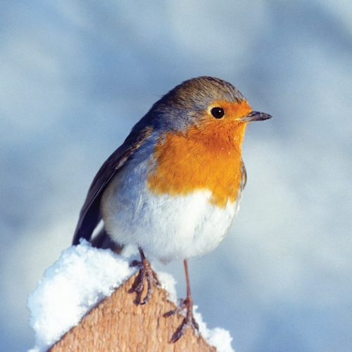 Robin on snowy fence post